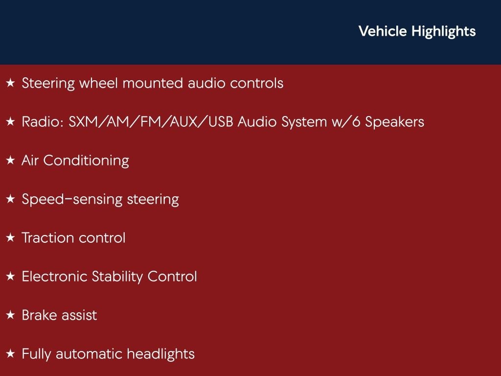 - Radio: SXM/AM/FM/AUX/USB Audio System w/6 Speakers