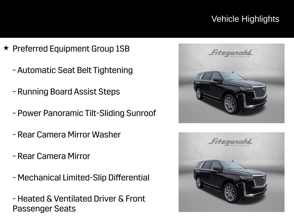 2023 Black Raven Cadillac Escalade 10-Speed Automatic AWD, Black Leather, Adaptive Cruise Control, AKG Studio 19-Speaker Audio System, Automatic Seat Belt Tightening, Bright Sport Mesh Grille (LPO), Door Lock & Latch Shields, Enhanced Automatic Emergency Braking, Enhanced Automatic Parking Assist, Glass Breakage Sensor, Heated & Ventilated Driver & Front Passenger Seats, Lane Change Alert w/Side Blind Zone Alert, Mechanical Limited-Slip Differential, Monochrome Cadillac Emblems (LPO), Power Panoramic Tilt-Sliding Sunroof, Preferred Equipment Group 1SB, Puddle Lamps w/Cadillac Crest (LPO), Radiant Package (LPO), Rear Camera Mirror, Rear Camera Mirror Washer, Rear Cross Traffic Alert, Reconfigurable Full-Color Head-Up Display, Reverse Automatic Braking, Running Board Assist Steps, Theft-Deterrent Alarm System, Vehicle Inclination Sensor, Vehicle Interior Movement Sensor, Wheels: 22 12-Spoke Chrome Alloy (LPO), Wheels: 22 Interim (LPO). 6.2L V8 Premium Luxury Cadillac Certified Pre-Owned Details:
