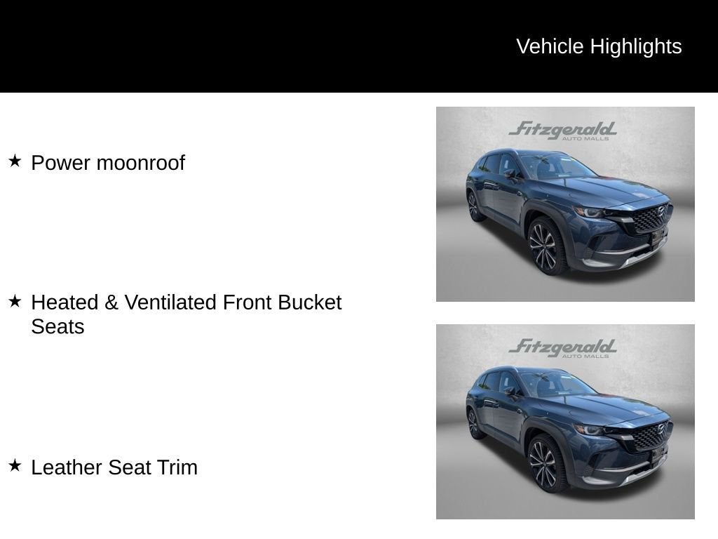 2023 Ingot Blue Mica Mazda CX-50 6-Speed Automatic Heated & Ventilated Front Bucket Seats, Leather Seat Trim, Power moonroof. 2.5L I4 Turbocharged DOHC 16V LEV3-ULEV125 227hp 2.5 Turbo Premium Plus Package You will love our NO HAGGLE, NO HASSLE PRICING here at Fitzgerald Auto Mall. Ask us about our BUYER PROTECTION PLAN, LOANER CAR PROGRAMS, AND FREE Vehicle History Report. Can not find what you want?? NO PROBLEM! We have over 1,000 Pre-Owned vehicles available at WWW.FITZMALL.COM. You can also visit us in person at 114 Baughmans Lane Frederick MD, 21702 or Call Us @240-629-7301.