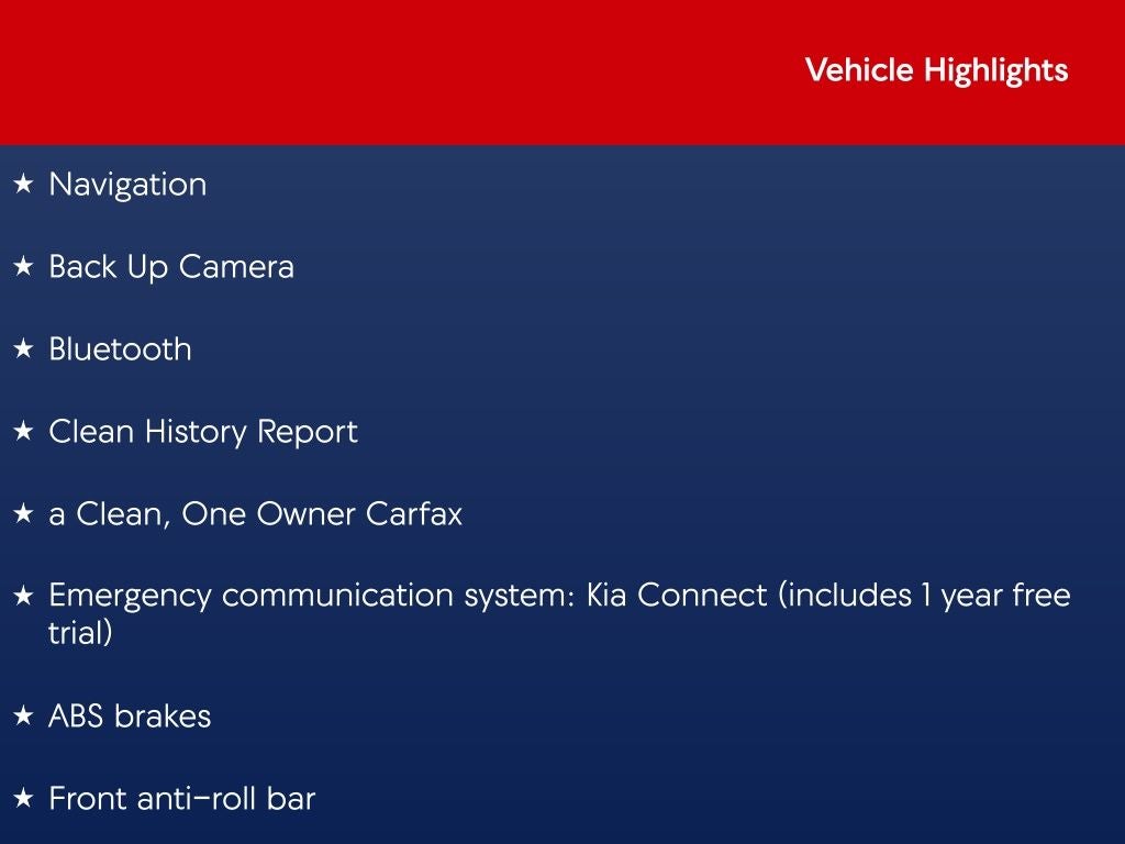 - Emergency SOS Capable Kia Connect (includes 1 year free trial) vehicle integrated emergency SOS system